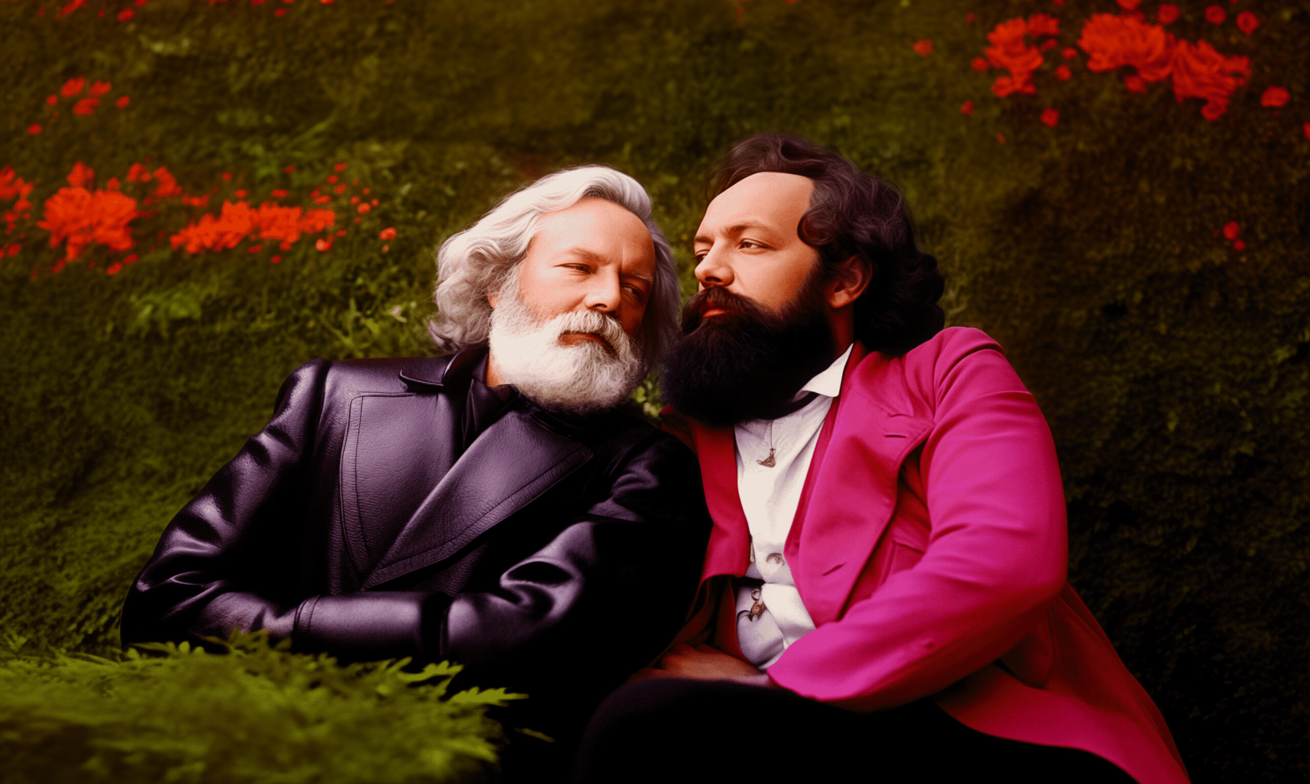 In the dim light of the study, where the scent of leather and paper mingled, Marx looked up from his desk, his face etched with lines of worry. "Alas, Friedrich ," he said, the weight of his troubles casting a shadow upon his words, "the affair of the bill has become a most vexing sonnet, its final couplet ever elusive and fraught with despair."Engels, taking Marx’s hand softly, "look not upon it with such sorrow. What is mine is ours, and what we build, we build together. My pocket is open to you, as is my heart, always."Engels's embrace was as firm as the ancient oaks that lined the streets of London. "Our path is one, Karl, shared in both our triumphs and our trials. Your cause is mine to champion, as is every victory that awaits us beyond this temporary plight."Marx chuckled. "And yet here I am, once again extending my hand, not for a dance, but in need. Your belief in me is a balm to my weary soul.""In love, in theory, in struggle—we are partners, brothers... lovers. And every ledger, every note, is but a footnote in our shared legacy. You shall never forget this, my wild little boar.", whispered Engles with a gentle, earnest look in his eyes.